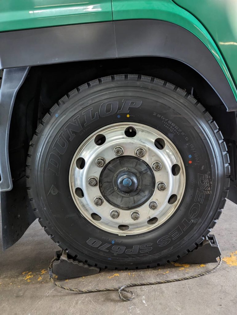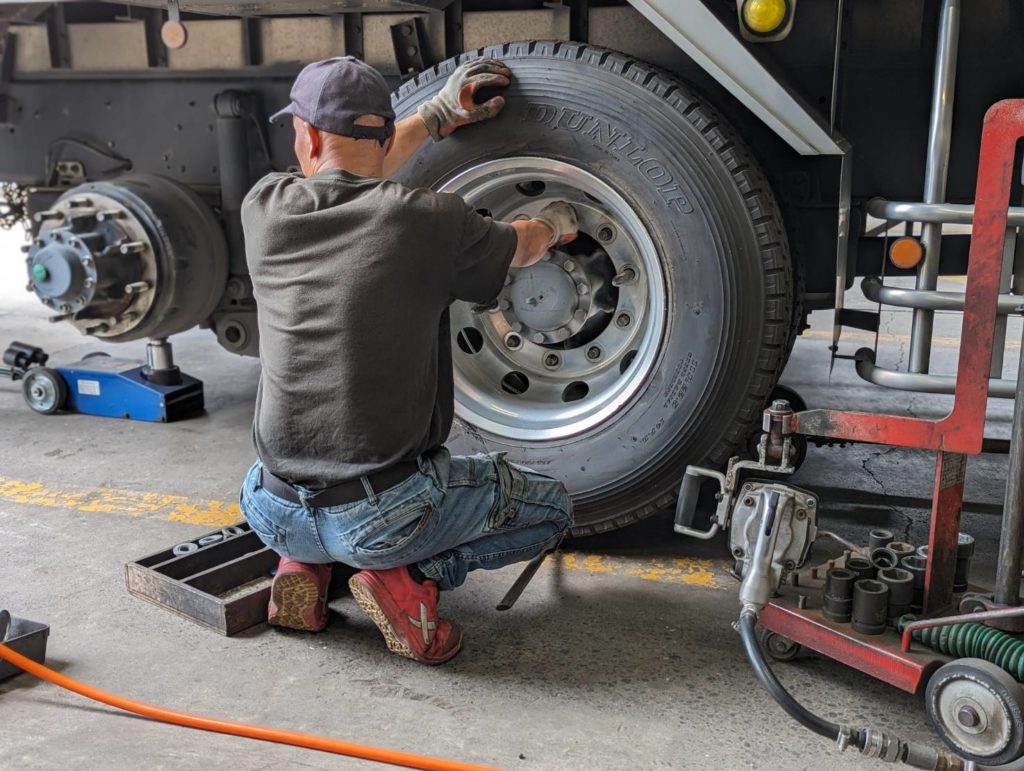 現在は大型タイヤを主力商品とし、契約法人様には24時間ロードサービスや、月一回のタイヤ点検サービスをご提供しております。